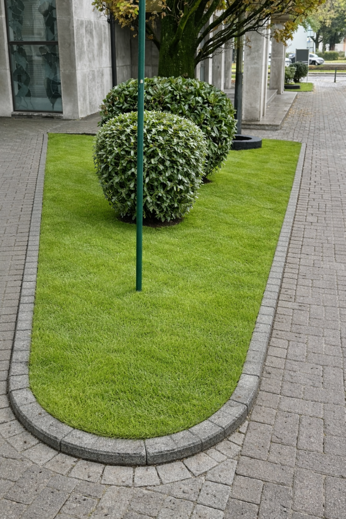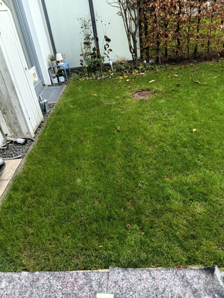 Hübsches urbanes Rasengebiet mit Sträuchern Links vor und Mitte nach unserer sorgfältigen Arbeiten